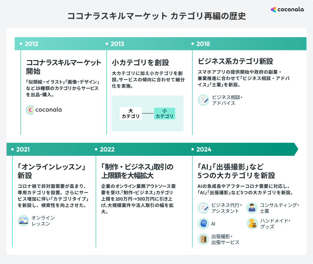 「個人の知識・スキル・経験を可視化し、必要とする全ての人に結びつけ、個人をエンパワーメントするプラットフォームを提供する」というミッションのもと、2012年にココナラスキルマーケットを開始。当初はオンラインでどのようなサービスでも500円で出品・購入できることから、似顔絵やイラスト、さらには旅行・お出かけのアドバイスなど、幅広いカテゴリのサービスが取引されました。その後、スマホアプリの提供開始やテレビCMの放映、そして新型コロナウイルス禍における外出制限やリモートワークの普及といった環境の変化も追い風となり、出品サービス数は順調に増加。サービス開始から約13年で、累計出品サービス数が100万件を突破しました。