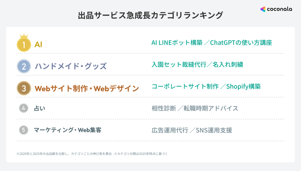 2020年と2025年を比較した出品サービス数の成長率を調査した結果、「AI」関連のサービスが急成長していることが判明しました。ChatGPTなど生成AIの台頭を受け、その使い方や効果的な指示(プロンプト)の構築代行といったサービス出品が増加しています。これは利用者の需要とも連動しており、2025年3月公開の「ビジネスシーンでのココナラ利用実態調査」においても、取引数の急上昇ランキングで堂々の1位に輝くなど、企業や個人事業主によるAI活用のニーズの高さが、出品数の増加を強く後押ししていると分析します。