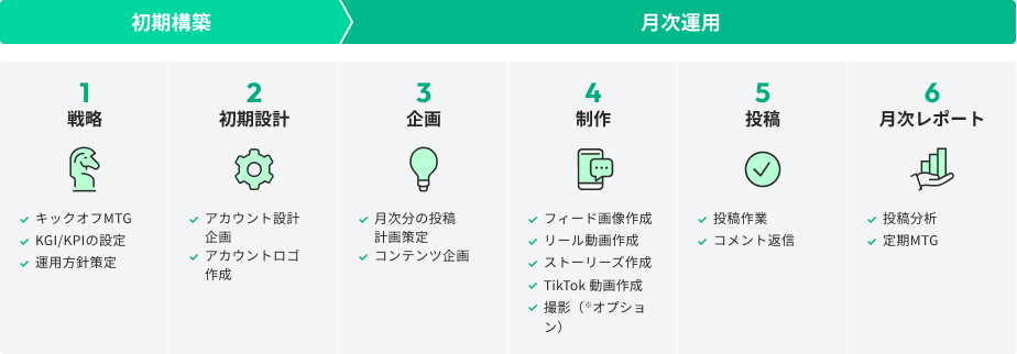 戦略設計からアカウント構築、コンテンツ制作、運用・分析まで、各領域のプロが専任チームを編成し、企業のSNS運用を一気通貫で代行。人的リソースの確保や内製化のコストを削減し、企業は本業へ集中することができます。