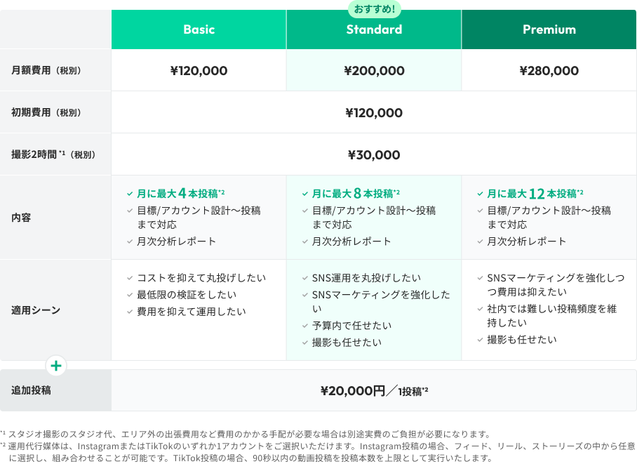 フルパッケージが月額12万円〜と、業界トップクラスのリーズナブルな価格帯で提供。投稿本数や運用目的に合わせて選べる3つのプランを用意し、初めてSNS運用代行を利用する企業でも予算を組みやすい、明快な価格設計を実現しました。