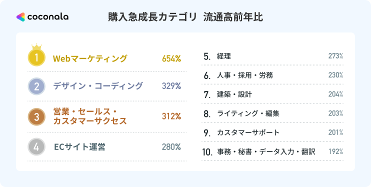 『ココナラアシスト』において、前年比で最も高い成長を遂げたのは、「Webマーケティング(654%)」、次いで「デザイン・コーディング(329%)」となりました。