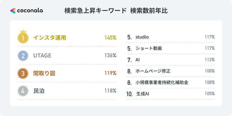 また、ITツールの運用領域では「UTAGE」や「studio」といった特定ツール名の検索が急上昇しました。背景には、導入したものの運用人材が不在という課題から、ピンポイントな専門スキルを外部に求める現状がうかがえます。そして、「小規模事業者持続化補助金」もランクイン。物価高や人件費高騰の中、複雑な公的支援の活用を専門家に相談しているケースが増えていることが予想されます。