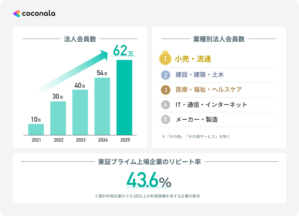 ● 『ココナラスキルマーケット』のビジネス目的での登録アカウントは62万件を突破し、スタートアップから大手企業まで幅広く活用が進む。東証プライム上場企業の約4割がリピート利用しており、外部人材の活用が一過性ではなく、経営の定常的な手段として定着しつつあることがうかがえる。