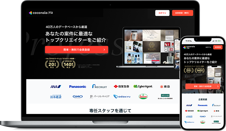 実名トップクリエイターをご紹介厳選されたトップクリエイターにロゴや動画、Webサイトなど制作系案件を依頼できるサービス。契約主体は当社となるため、あらゆる面でのクオリティ担保を実現しており、ビジネスシーンにおいても安心してご利用いただけます。